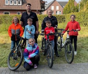 Vor den Herbstferien wurden ebenso die Fahrräder auf Verkehrssicherheit überprüft. Kompetente Unterstützung erfuhren unsere Kinder wieder durch die Polizeistation Wietmarschen, die durch Polizeioberkommissarin Striedelmeyer und Polizeihauptkommissar Arnold bestens vertreten war. Glücklicherweise wurden kleine Mängel an den Fahrrädern direkt von eifrigen Mitarbeitern der DROB Nordhorn behoben.